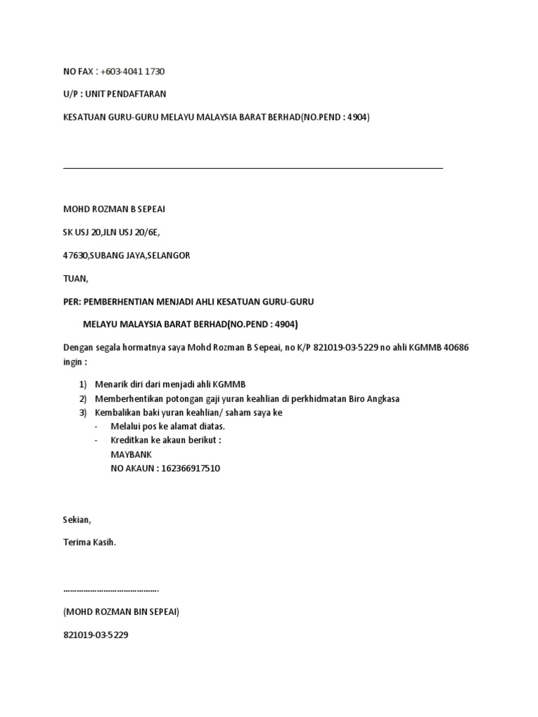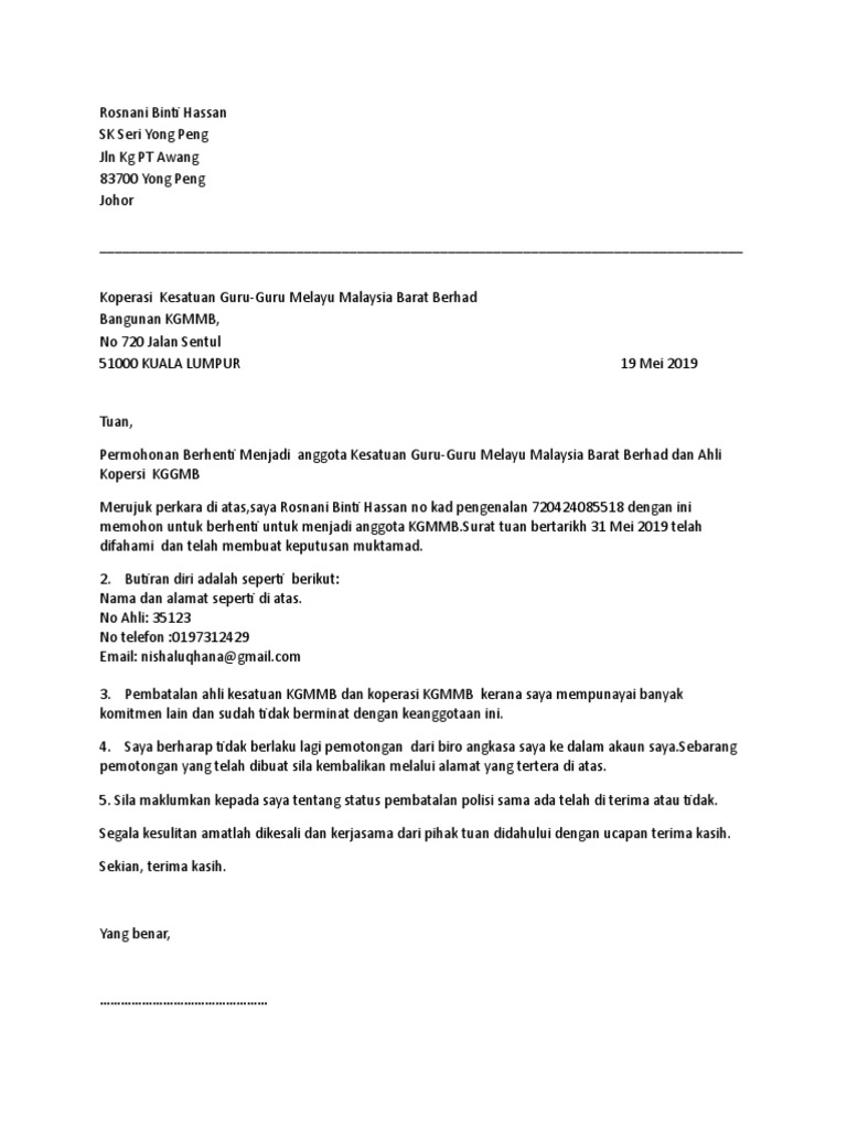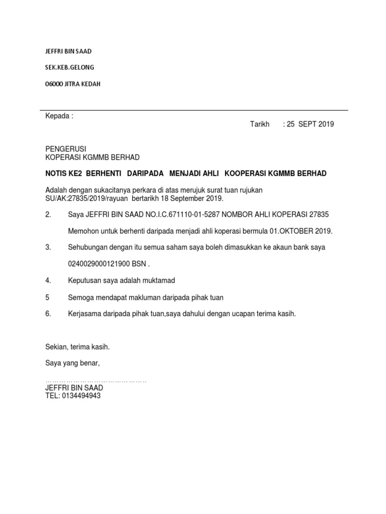 Surat Mohon Berhenti Ahli Koperasi Kgmmb Berhad Pdf